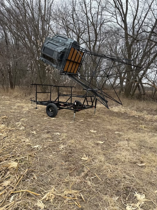 Aluminum hunting blind trailer will fit most blinds. The trailer pictured has a 5x5' or 4x4' platform base and blind sits 5' off the ground. Also available in 6x6' and 4x8' base platforms. Will fit most blinds on the market. The trailer has patented leveling legs, removable extra step, quick and easy setup and lights for road legal use. Made in America. Can ship out of state as well. Blind is not included in the price but is for reference only. The youtube link shows setup. Allow 1-2 weeks for shipping or pickup.